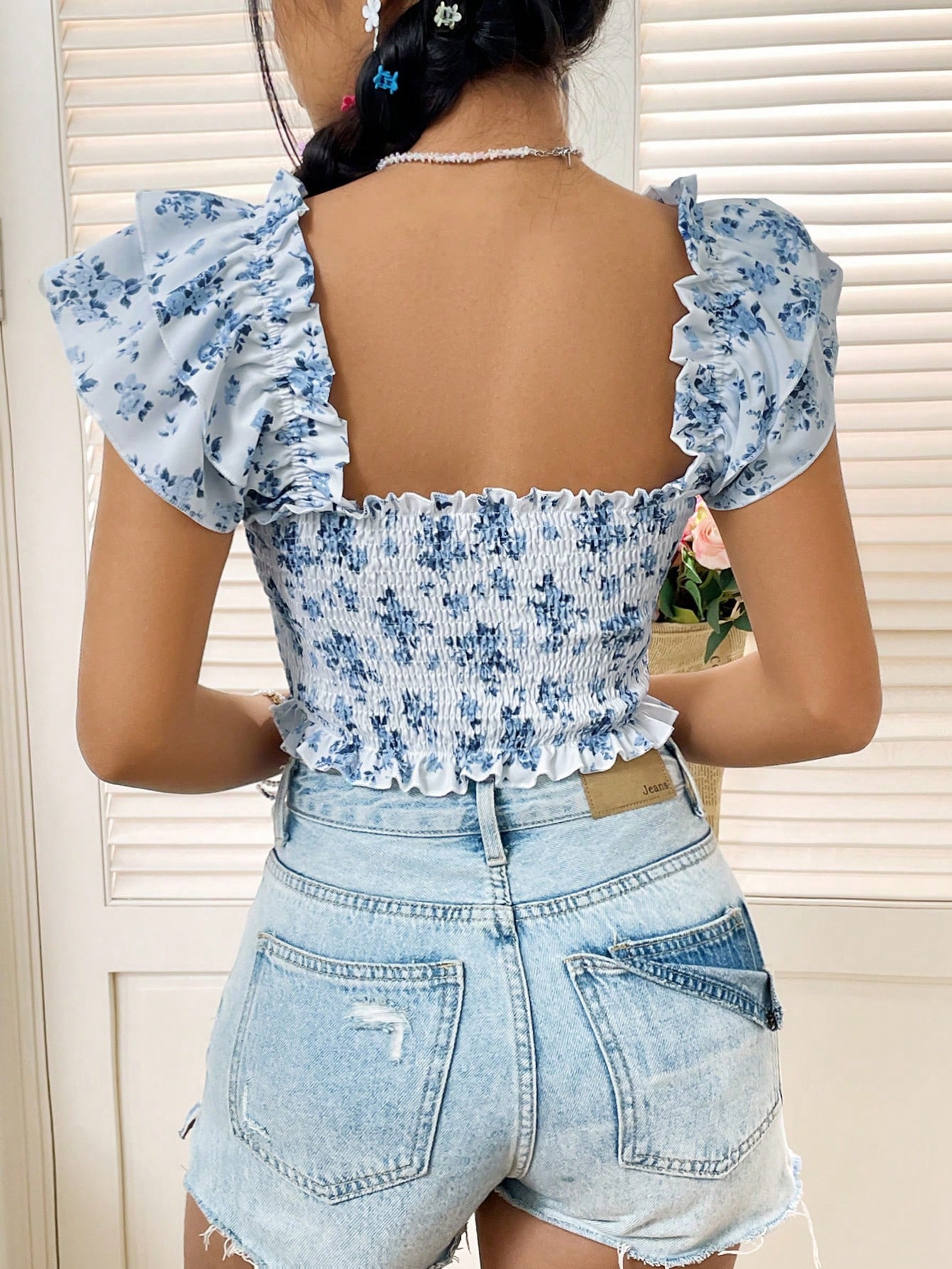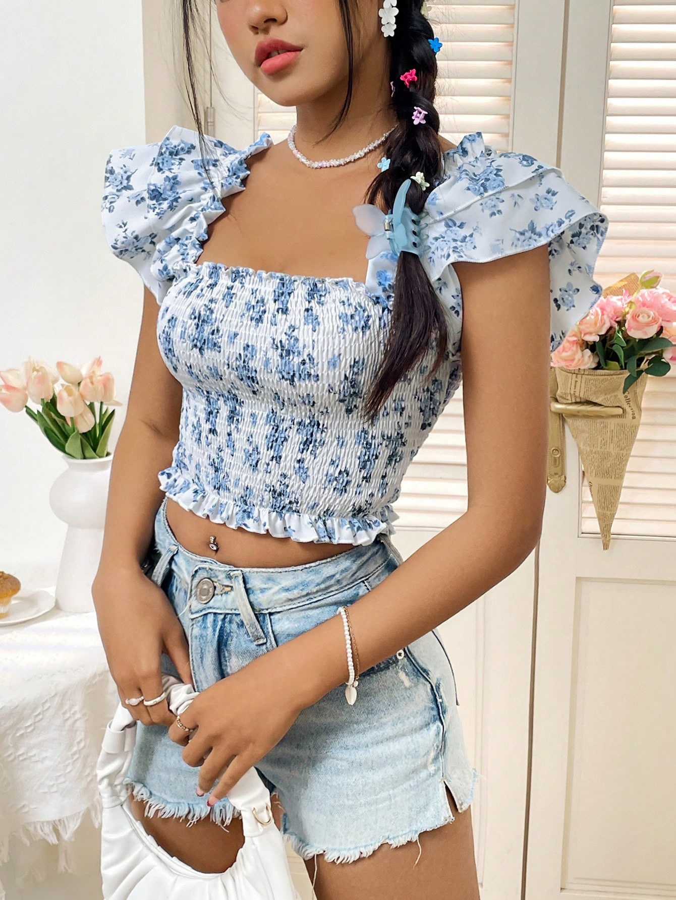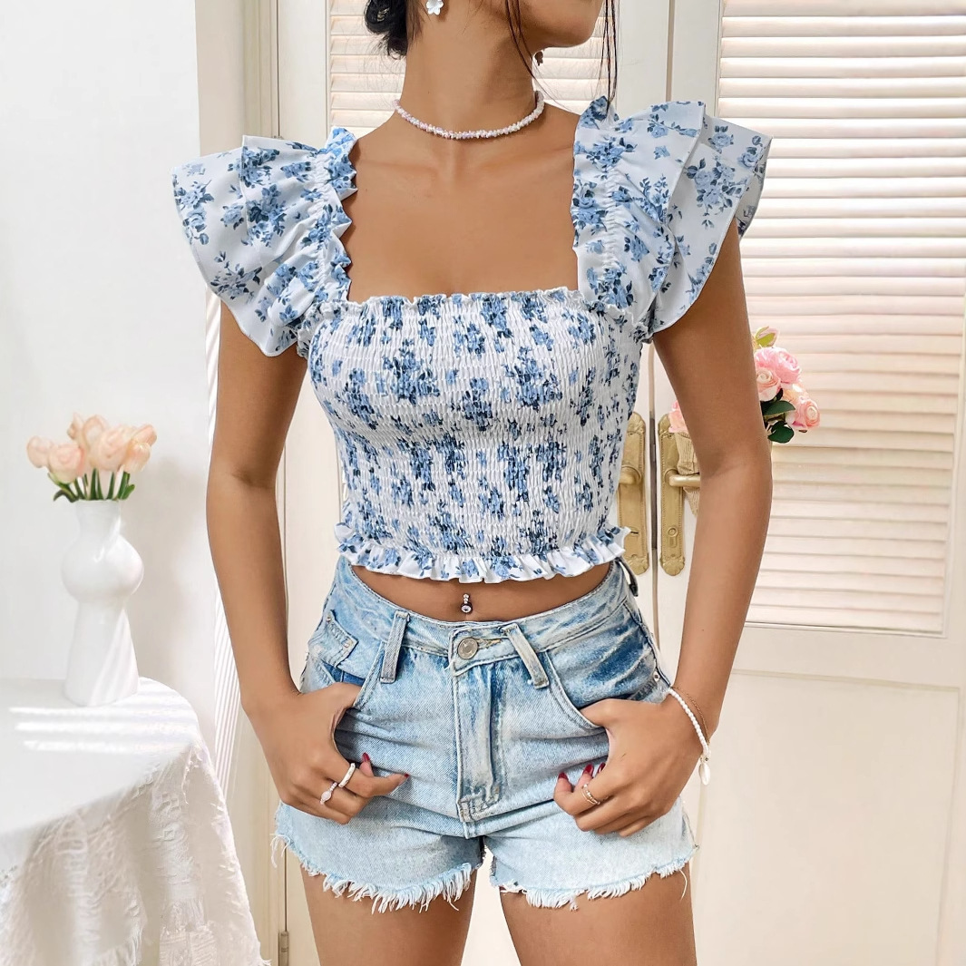 European And American Instagram-style Summer Floral-print Square-neck Top With Puff Sleeves For Women
